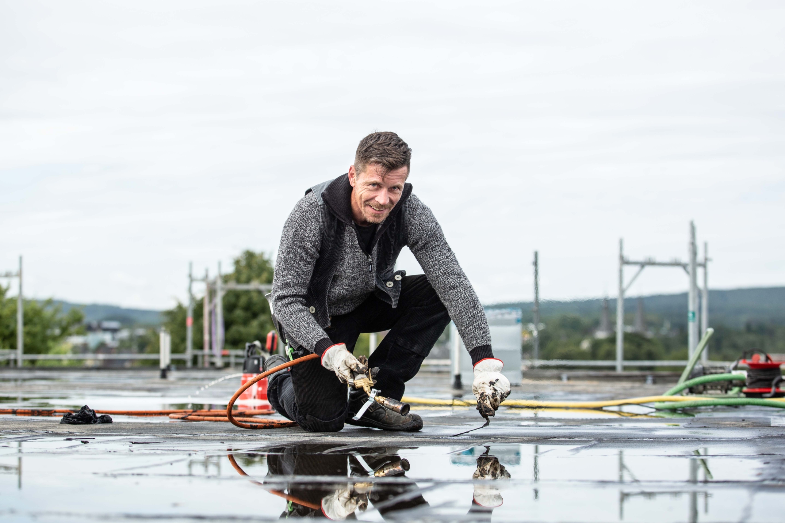 Ein Mitarbeiter bringt trotz Feuchtigkeit Top-Leistung bei der Dachabdichtung – mit Erfahrung und einem Lächeln.