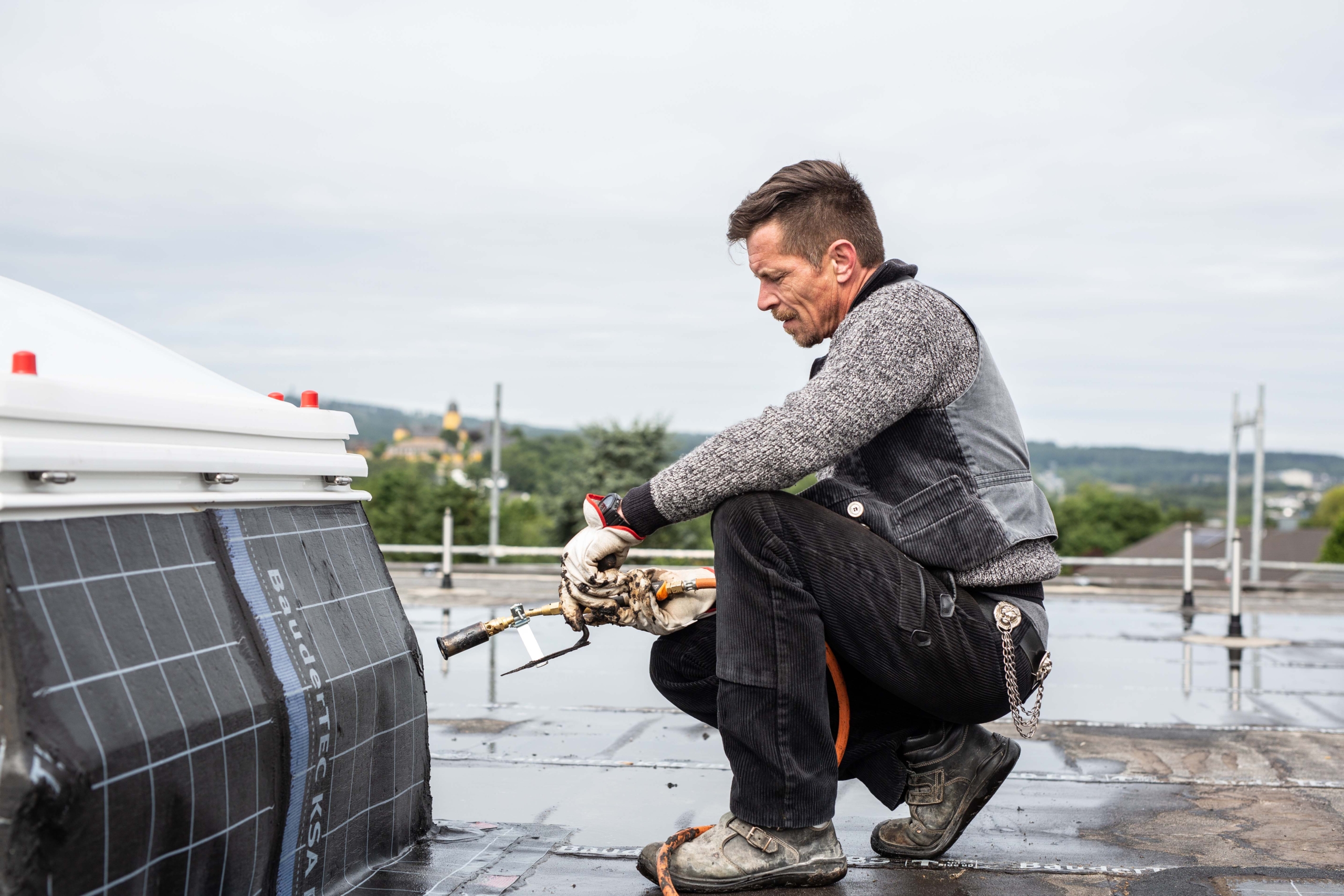 Dachdecker führt Abdichtungsarbeiten mit Gasbrenner aus